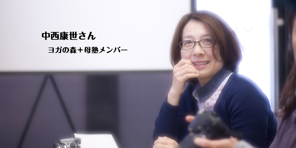 中西さんは、いつもはおとなしくて聞き上手なのですが、ぽろっと出る一言がとても的を射ていて、ツボに入ります。全体をよく見てくださっていて安心して心を開いたお話が出来ます。スタイル抜群なので、ヨガの時のポージングも素敵に決まって憧れています。ヨガも母塾もいつもご参加ありがとうございます。